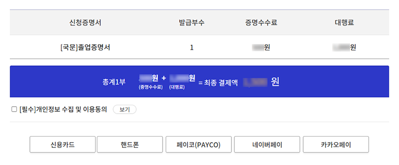 • ⑤발급받을 증명서 부수와 용도 제출처를 입력하고 저장시 하단 증명서신청내역 부분에 신청한 증명서 내역확인 후 다음클릭